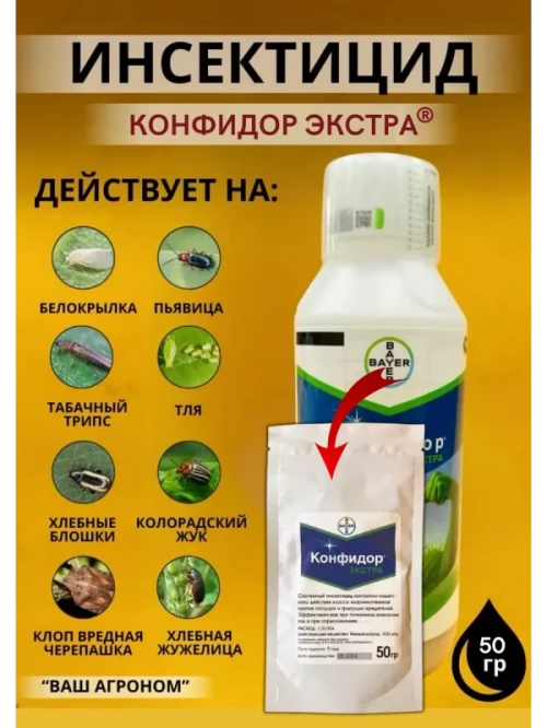 Конфидор Экстра – системный инсектицид контактно-кишечного действия класса хлорникотинилов против сосущих и грызущих вредителей. Эффективен как при почвенном внесении так и при опрыскиваниях.