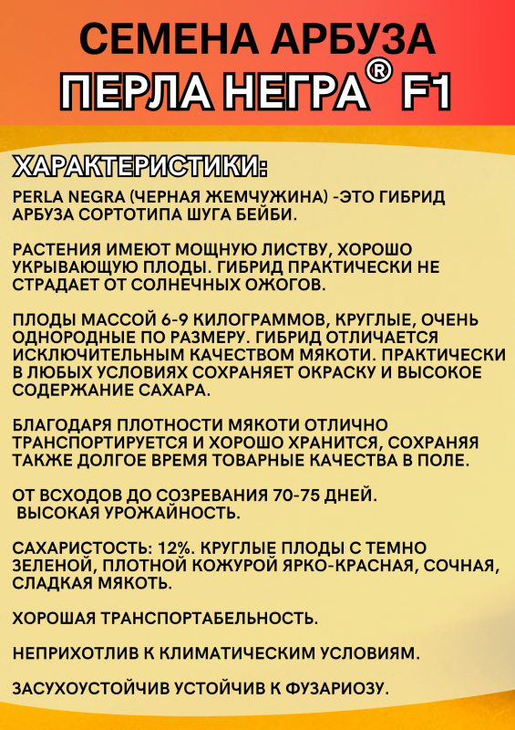 Арбуз Перла Негра F1 (Perla Negra F1), известный также как Черная Жемчужина, — среднеранний гибрид сортотипа Шуга Бейби, отличающийся высокой пластичностью и стабильной урожайностью в разных климатических условиях. Период созревания — 70–75 дней от всходов.
