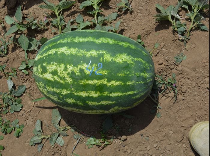 Растение сбалансированное, мощное, с высокой завязываемостью плодов. Плоды овально-округлой формы, средней массой 9–12 кг, кожура зеленого цвета с темно-зелеными широкими полосами, плотная, надежно защищает мякоть.