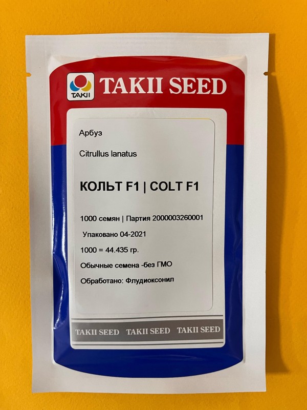 Арбуз Кольт F1 — среднеранний диплоидный гибрид типа Кримсон Свит от компании Take Seeds (Голландия). Период созревания: 70–75 дней от массовых всходов, в пленочных укрытиях или на открытом грунте.