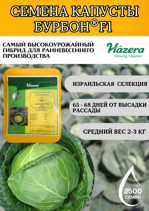 Бурбон F1 — высокоурожайный ранний гибрид белокочанной капусты, созданный селекционерами компании Hazera. Период созревания составляет 55–60 дней после высадки рассады, что делает его одним из самых скороспелых гибридов в своём классе.