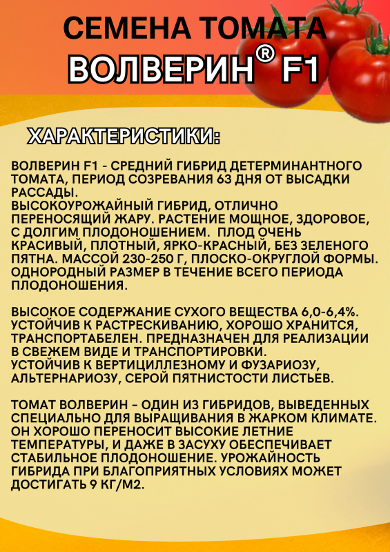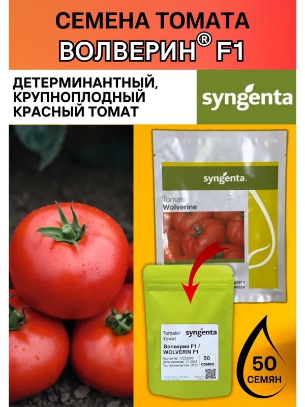Волверин F1 (Syngenta / Сингента) — раннеспелый детерминантный гибрид крупноплодного томата для свежего рынка и переработки. Созревает через 63 дня после высадки рассады, формируя мощное растение с развитым листовым аппаратом, обеспечивающим защиту плодов от солнечных ожогов.
