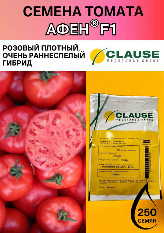 Томат Афен F1 (Afen F1) — высокоурожайный розовоплодный гибрид от французской компании Clause, предназначенный для выращивания в открытом и закрытом грунте. Подходит для первого и второго оборота, отличается стабильной завязываемостью даже при резких перепадах температур и на тяжелых почвах.
