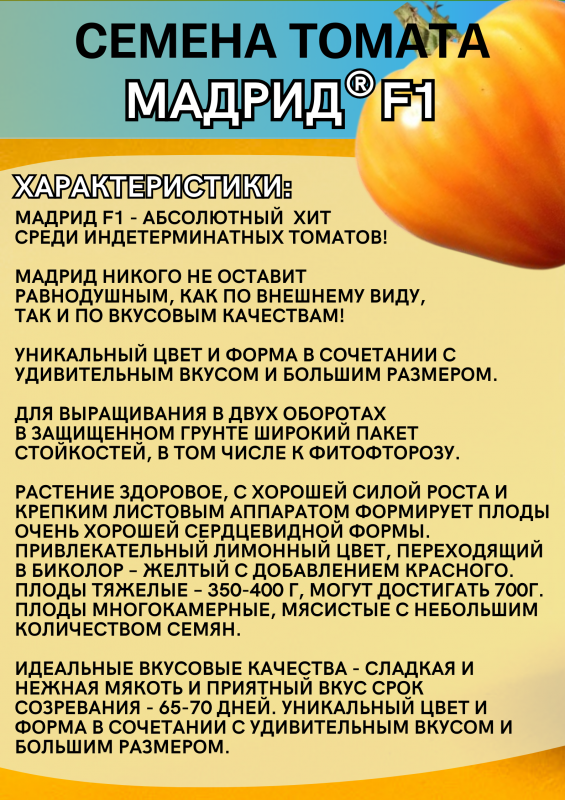 Гибрид Мадрид F1 — настоящее произведение селекционного искусства, ориентированное на премиальный сегмент свежего рынка. Его главная отличительная черта — уникальная комбинация экзотического внешнего вида и эталонного вкуса. Плоды имеют очень красивую, правильную удлиненно-сердцевидную форму с выраженной ребристостью. Окраска — привлекательный лимонно-желтый цвет, переходящий в биколор с добавлением красных прожилок и разводов, что делает каждый плод неповторимым.