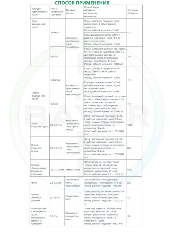 Полив (капельный) под корень 0,15 %-й рабочей жидкости через 2-3 дня после высадки рассады на постоянное место, последующие поливы - с интервалом 14 дней.