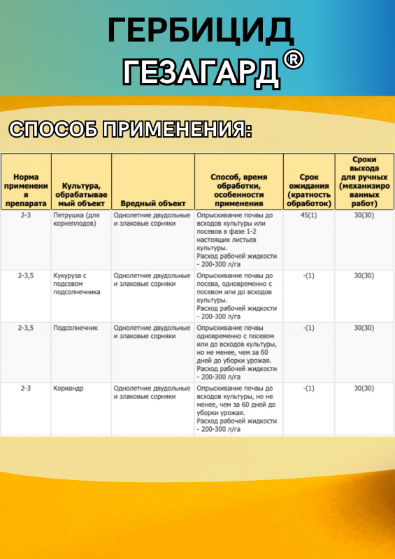 2-3,5 | Подсолнечник | Однолетние двудольные и злаковые сорняки | Опрыскивание почвы одновременно с посевом или до всходов культуры, но не менее, чем за 60 дней до уборки урожая. Расход рабочей жидкости - 200-300 л/га | -(1) | 30(30) |