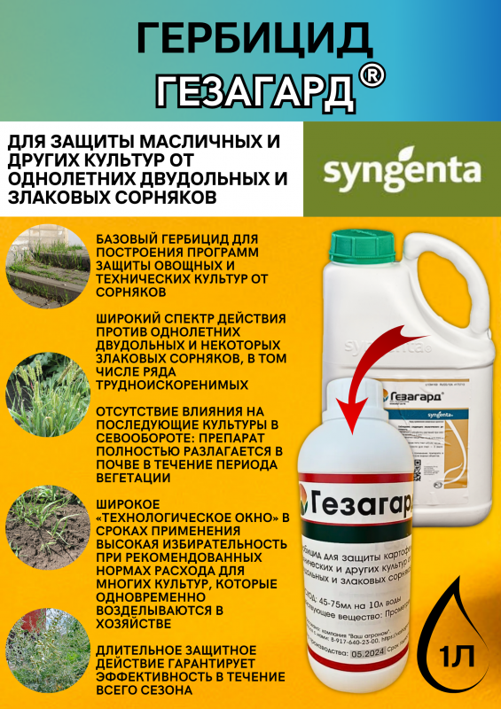 Гербицид Гезагард, КС — это классический селективный почвенный и послевсходовый гербицид на основе прометрина для защиты широкого спектра культур (картофель, овощные, бобовые, технические) от однолетних двудольных и злаковых сорняков. Препарат обеспечивает надежный и длительный контроль сорной растительности, уничтожая ее в момент прорастания.