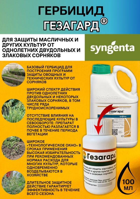 Гербицид Гезагард, КС — это классический селективный почвенный и послевсходовый гербицид на основе прометрина для защиты широкого спектра культур (картофель, овощные, бобовые, технические) от однолетних двудольных и злаковых сорняков. Препарат обеспечивает надежный и длительный контроль сорной растительности, уничтожая ее в момент прорастания.