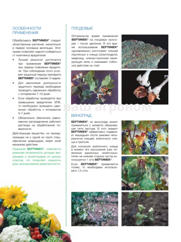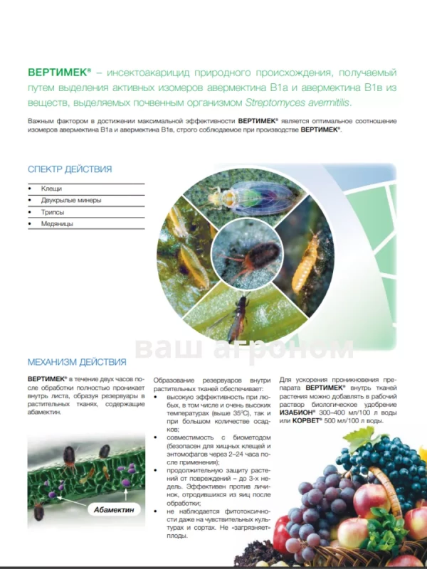 Вертимек  - инсектоакарицид кишечно-контактного действия для защиты овощей защищенного грунта, цветочных и горшечных культур защищенного и открытого грунта, а также яблони и винограда от клещей, трипсов и яблонной медяницы.